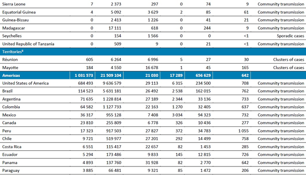 Amerika Bölgesi geçen haftaya göre %3 artışa karşılık gelen, 1 milyondan fazla yeni vaka bildirmiştir. Bölge, geçen hafta küresel olarak bildirilen tüm ölümlerin %32'sini oluşturmuştur (n=17.289). Amerika Birleşik Devletleri, Brezilya, Arjantin, Kolombiya ve Meksika, son 7 gün içinde en yüksek yeni vaka sayısını bildirmiştir.