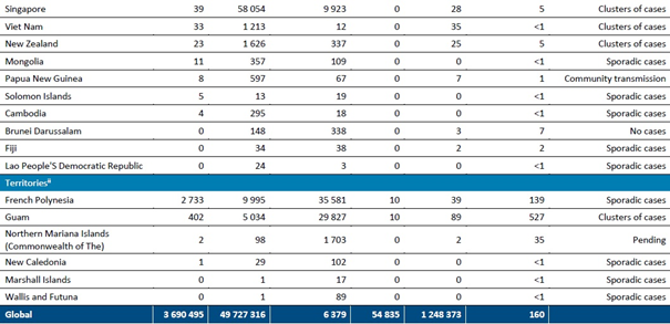 Batı Pasifik'te geçtiğimiz hafta bildirilen yeni vaka sayısı (31.370), bir önceki haftaya göre %19 artışla küresel olarak en yüksek oranda artmıştır. Bu artışa rağmen, bildirilen yeni vaka sayısı, geçen hafta küresel olarak bildirilen yeni vakaların %1'ine karşılık gelmektedir. Yeni ölümlerin sayısı bir önceki haftaya göre %5 daha düşüktür. Filipinler, Malezya, Japonya ve Fransız Polinezyası, bölgedeki en yüksek yeni vaka sayısını bildirmeye devam etmektedir: Filipinler 13.232 yeni vaka (1 milyonda 121 yeni vaka), Malezya 7809 yeni vaka (1milyonda 241 yeni vaka) ve Japonya 5940 yeni vaka (1 milyonda 47 yeni vaka) bildirmiştir.