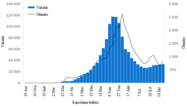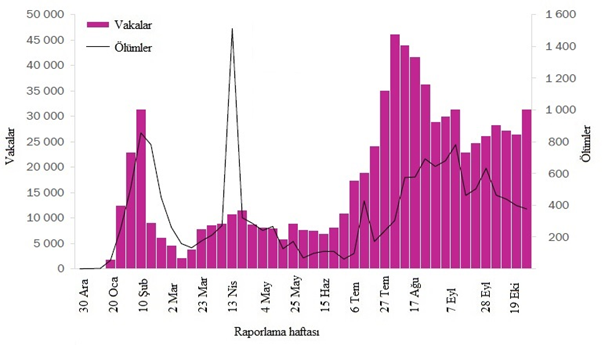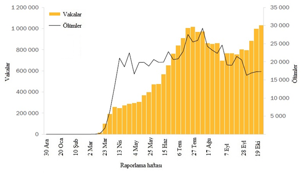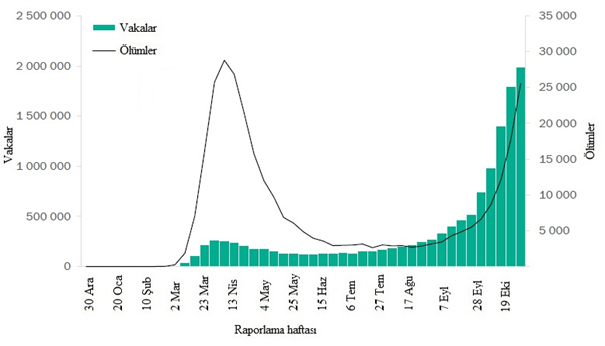 Geçen hafta, küresel COVID-19 vaka sayısı önceki haftaya göre %8 artarak 3.6 milyondan fazla yeni vaka oluştururken, yeni ölümler %21 artarak 54.000'in üzerine çıkmıştır. Bu, pandeminin başlangıcından bu yana kümülatif sayıları, 49,7 milyondan fazla rapor edilmiş vakaya ve dünya genelinde 1,2 milyondan fazla ölüme getirmektedir. Avrupa Bölgesi, son 7 gündeki yeni vaka ve ölümlerdeki en büyük oranı oluşturmaya devam etmektedir; bölge tüm yeni vakaların yarısından fazlasını (%54) ve yeni ölümlerin yaklaşık yarısını (%47) bildirmiştir. Hala küresel toplam vaka ve ölüm sayısının sadece %2'sini oluştursa da, Batı Pasifik Bölgesi bu hafta, bir önceki haftaya göre yeni vakalardaki en büyük nispi oransal artışı (%19) göstermiş ve onu Doğu Akdeniz Bölgesi (%18) ve Avrupa Bölgesi (%11) takip etmiştir. Yeni bildirilen ölümlerde bir önceki haftaya göre son 7 günde en yüksek orantılı artışları bildiren üç bölge Avrupa (%44), Afrika (%30) ve Doğu Akdeniz (%23) bölgeleri olmuştur. Batı Pasifik Bölgesi, bir önceki haftaya göre bu hafta ölümlerde düşüş (%5) bildiren tek bölge olmuştur.