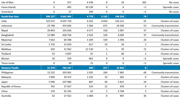 Güneydoğu Asya Bölgesi, son altı hafta içinde yeni vaka ve ölümlerde devam eden bir düşüş eğilimi gözlemlemişti. Ancak, son 7 günde bölgede yaklaşık 400.000 yeni vaka (haftalık %2 artış) ve 5.000'den fazla ölüm (haftalık %10 artış) rapor edilmiştir. Güneydoğu Asya bölgesinde en çok yeni vaka bildiren ülkeler Hindistan, Endonezya ve Nepal olmaya devam ederken, en yüksek ölüm oranları Nepal ve Myanmar'da kaydedilmiştir.