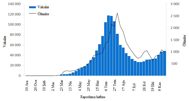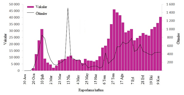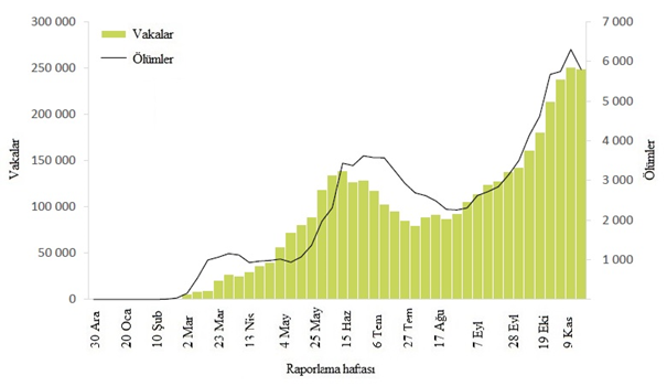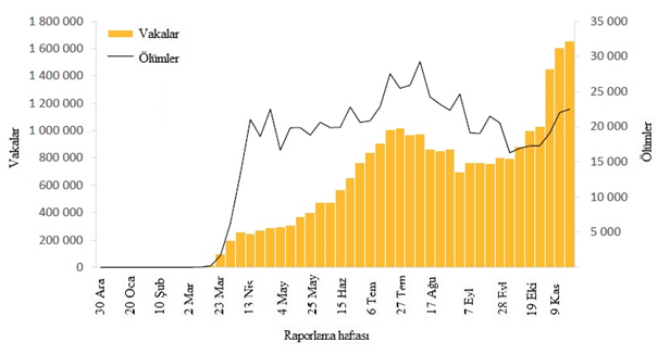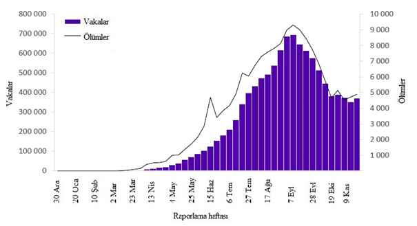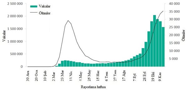 Şekil 6: DSÖ Avrupa Bölgesi tarafından 29 Kasım 2020 itibarıyla haftalık olarak bildirilen COVID-19 vakalarının ve ölümlerin sayısı**