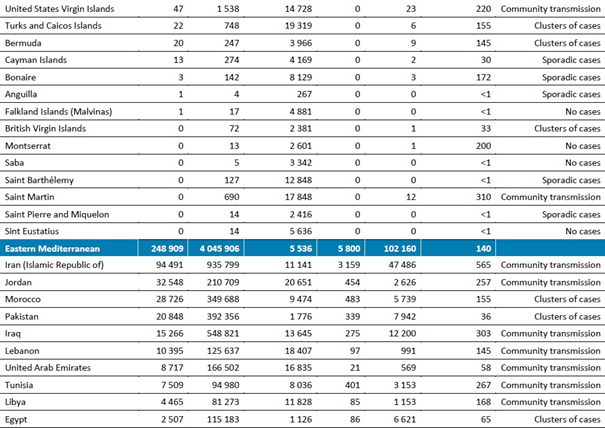 Haftalık vakalardaki on beş haftalık sürekli artıştan sonra, hem yeni vakalar (248.000) hem de yeni ölümler (5800), Doğu Akdeniz Bölgesi'nde bir önceki haftaya göre sırasıyla %1'lik ve %8'lik hafif bir azalma göstermiştir (Şekil 5) . En yüksek sayıda yeni vaka İran İslam Cumhuriyeti (94.500 yeni vaka, 1 milyonda 1125 yeni vaka), Ürdün (32.500 yeni vaka, 1 milyonda 3200 yeni vaka), Fas (29.000 yeni vaka, 1 milyonda 780 yeni vaka), Pakistan (21.000 yeni vaka, 1 milyonda 94 yeni vaka) ve Irak'tan (15.000 yeni vaka, 1 milyonda 380 yeni vaka) bildirilmiştir.