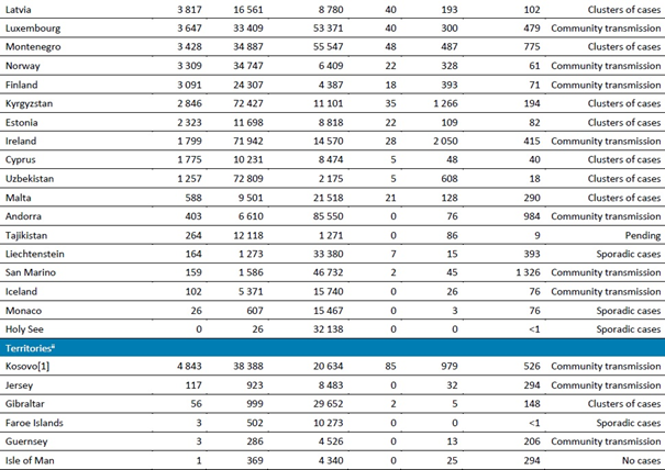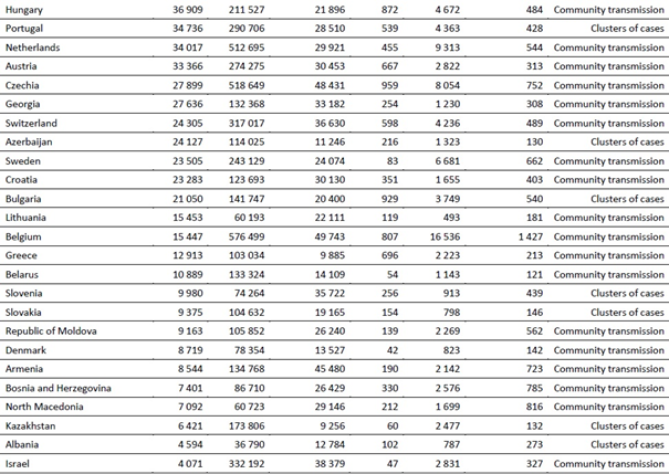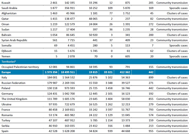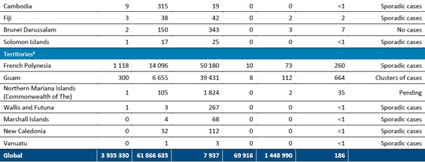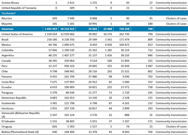 Geçen hafta, en fazla vaka bildiren beş ülke Amerika Birleşik Devletleri (önceki haftaya göre %0,3 artışla 1,1 milyondan fazla vaka bildirmiştir), Hindistan (297.000'den fazla vaka, %6 artış), Brezilya (218.000'den fazla yeni vaka, %4 artış), İtalya (184.000'den fazla yeni vaka, %22 azalma) ve Rusya Federasyonu (179.000'den fazla yeni vaka, %10 artış) olmuştur.