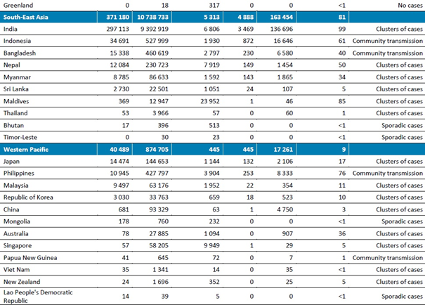 Güneydoğu Asya Bölgesinde haftalık yeni vakalar, geçtiğimiz hafta 371.180 vaka bildirilmesiyle, önceki dört hafta ile benzer seviyelerde kalmıştır. Vakalardaki eğilim, büyük ölçüde, bölgedeki yeni haftalık vakaların %80'ini bildiren Hindistan'daki vaka sayısından kaynaklanmaktadır. Myanmar, Sri Lanka ve Maldivler'de haftalık yeni vakalarda düşüş gözlenirken, Endonezya, Nepal, Tayland ve Butan'da artış bildirilmiştir. Geçen hafta, bir önceki haftaya göre %4 artış ile yedi ülkeden 4888 ölüm bildirilmiştir. En yüksek yeni vaka sayıları Hindistan (297.000 yeni vaka, 1 milyonda 215 yeni vaka), Endonezya (35.000 yeni vaka, 1 milyonda 127 yeni vaka), Bangladeş (15.000 yeni vaka, 1 milyonda 93 yeni vaka), Nepal (12.000 yeni vaka, 1 milyonda 415 yeni vaka) ve Myanmar'dan (8.800 yeni vaka, 1 milyonda 161 yeni vaka) bildirilmiştir.