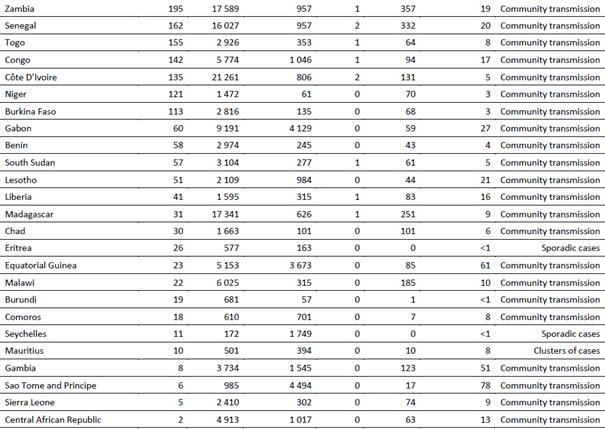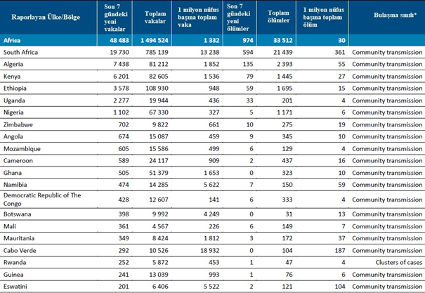 Afrika Bölgesi geçen hafta yaklaşık 48.000 yeni vaka ve 1000'in biraz altında yeni ölüm bildirmiştir; bir önceki haftaya göre sırasıyla %3 ve -%10'luk değişimler (Şekil 3). En yüksek sayıda yeni vaka ve ölüm, bölgedeki tüm yeni vakaların toplu olarak %81'ini oluşturan Güney Afrika (19.730 yeni vaka, 1 milyonda 333 yeni vaka), Cezayir (7438 yeni vaka, 1 milyonda 170 yeni vaka), Kenya (6201 yeni vaka, 1 milyonda 115 yeni vaka), Etiyopya (3578 yeni vaka, 1 milyonda31 yeni vaka), ve Uganda'dan (2277 yeni vaka, 1 milyonda 50 yeni vaka) bildirilmiştir.