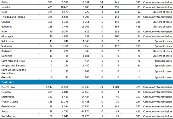 Kolombiya, 57.000 vaka (1 milyonda 1122 yeni vaka) ile bölgedeki dördüncü en yüksek yeni vaka sayısını bildiren ülke olmuştur. Yeni ölümlerin sayısı bir önceki haftaya göre %2 artarak 1285 yeni ölüme (1 milyonda 25,3 yeni ölüm) yükselmiştir. Pandemi başladığından bu yana Kolombiya, Ağustos ayında haftada neredeyse 78.000 vaka bildirilen vaka insidansında en az bir belirgin zirve görmüştür ve ardından ılımlı bir düşüş gelmiştir; ancak ülke Ekim başından bu yana haftada 50.000'den fazla yeni vaka ile karşı karşıya kalmaktadır. Bogota, Amazonlar ve Barranquilla en yüksek vaka insidansını bildirmiştir. Aktif vakaların %70'i evde, %26'sı genel hastanede ve %3'ü yoğun bakım ünitelerinde (YBÜ) bulunmaktadır. Erkekler vakaların %64'ünü oluşturmaktadır ve ölenlerin %77'si 60 yaş ve üzerindedir. Ülke olağanüstü hali üç ay uzatmıştır.