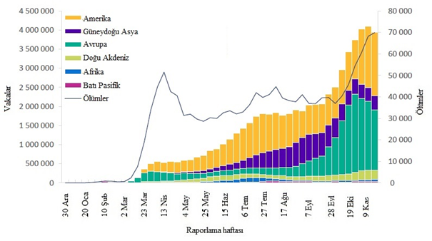 Şekil 1: 29 Kasım 2020 itibariyle DSÖ bölgeleri tarafından haftalık olarak bildirilen COVID-19 vakalarının ve ölümlerin sayısı**