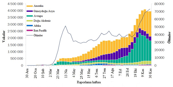 Devam etmekte olan COVİD-19 pandemisinde Amerika Bölgesindeki yeni vakalar ve ölümler, tüm yeni vakaların neredeyse yarısını ve bu haftaki tüm yeni ölümlerin üçte birinden fazlasını oluşturmaktadır. Avrupa Bölgesinde yeni vakalar yüksek seyrederken, yeni ölümler ikinci haftada da azalma göstermiştir. 7 Aralık itibariyle, pandeminin başlangıcından bu yana 65,8 milyondan fazla vaka ve 1,5 milyondan fazla ölüm bildirilmiştir.