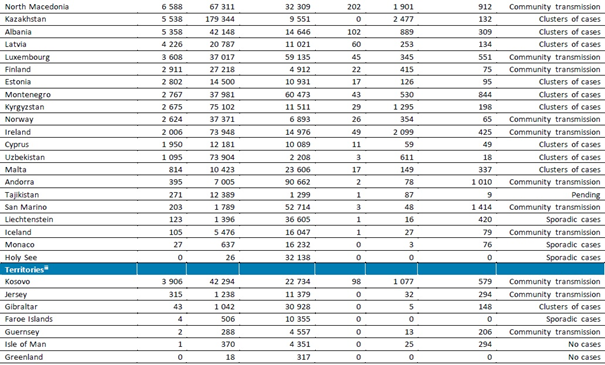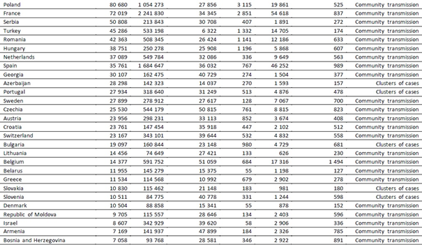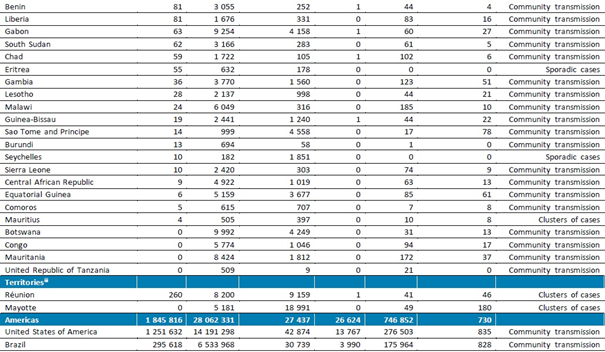 Geçen hafta, en fazla vaka bildiren beş ülke Amerika Birleşik Devletleri (1,2 milyondan fazla vaka bildirerek önceki haftaya göre %9 artışla), Brezilya (295.000'den fazla yeni vaka, %35 artış), Hindistan (251.000'den fazla vaka, %15 azalma), Rusya Federasyonu (191.000'den fazla yeni vaka, %6 artış) ve İtalya (145.000'den fazla yeni vaka, %21 azalma) olmuştur.