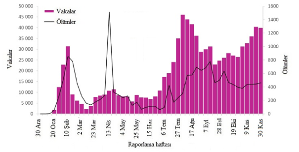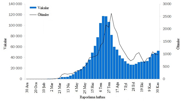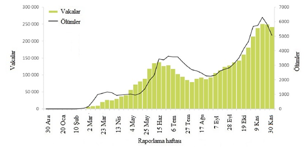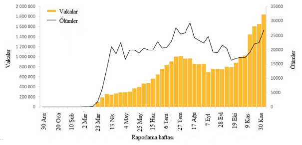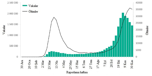 Şekil 6: DSÖ Avrupa Bölgesi tarafından 6 Aralık 2020 itibarıyla haftalık olarak bildirilen COVID-19 vakalarının ve ölümlerin sayısı**