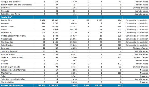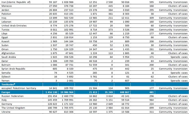 Art arda ikinci hafta, hem yeni vakalar hem de yeni ölümler azalmıştır. Doğu Akdeniz Bölgesi, bir önceki haftaya göre sırasıyla %2 ve %12'lik bir düşüşü yansıtan 240.000'den fazla yeni vaka ve 5000'den fazla yeni ölüm bildirmiştir (Şekil 5). Afganistan, Mısır, işgal altındaki Filistin bölgesi, Umman ve Somali'de hem yeni haftalık vakalarda hem de yeni haftalık ölümlerde artışlar bildirilmiştir. En yüksek yeni vaka sayılarını bildiren ülkeler İran İslam Cumhuriyeti (93.187 yeni vaka, 1 milyonda 1109 yeni vaka), Fas (27.050 yeni vaka, 1 milyonda 733 yeni vaka), Ürdün (26.804 yeni vaka, 1 milyonda 2627 yeni vaka), Pakistan (20.835 yeni vaka, 1 milyonda 94 yeni vaka) ve Irak (13.699 yeni vaka, 1 milyonda 341 yeni vaka) olmuştur.