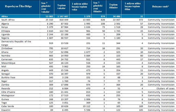Geçtiğimiz yedi gün içinde, Afrika Bölgesinde 1000'in altında bildirilen ölümle ölümler geçen haftaya benzer kalırken, bir önceki haftaya göre %9 artışla 53.000'den fazla yeni vaka bildirilmiştir (Şekil 3). Güney Afrika, bölgedeki yeni haftalık vakaların en büyük oranını (%48) oluşturmaya devam etmektedir. Son yedi gün içinde, en yüksek yeni vaka sayısını bildiren ülkeler Güney Afrika (25.310 yeni vaka, 1 milyon nüfus başına 427 yeni vaka), Cezayir (6290 yeni vaka, 1 milyon nüfus başına 143 yeni vaka), Kenya (5379 yeni vaka, 1 milyon nüfus başına 100), Etiyopya (3810 yeni vaka, 1 milyon nüfus başına 33 yeni vaka) ve Uganda (2244 yeni vaka, 1 milyon nüfus başına 49) olmuştur.