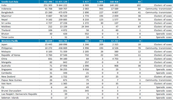 Güneydoğu Asya Bölgesinde, yeni haftalık ölümlerin önceki haftaya göre %2'lik hafif bir artış göstermesine rağmen (5004 yeni ölüm, 1 milyon nüfus başına 2 yeni ölüm), geçen hafta bildirilen yeni vakalar, önceki haftaya göre %10 azalmıştır (332.396 yeni vaka, 1 milyon nüfus başına 164 yeni vaka) (Şekil 7). Vaka ve ölümlerdeki eğilimler hala büyük ölçüde Hindistan'dan kaynaklanmaktadır ve ülke, bölgede yeni haftalık vaka ve ölümlerin sırasıyla %76 ve %70'ini rapor etmektedir. Hindistan, Nepal ve Maldivler'de haftalık yeni vakalarda azalma bildirilirken, Butan, Endonezya, Myanmar, Sri Lanka ve Tayland'da artış bildirilmiştir. En yüksek yeni vaka sayısını bildiren ülkeler Hindistan (251.303 yeni vaka, 1 milyonda 182 yeni vaka), Endonezya (41.708 yeni vaka, 1 milyonda 152 yeni vaka) ve Bangladeş (15.260 yeni vaka, 1 milyonda 93 yeni vaka) olmuştur.