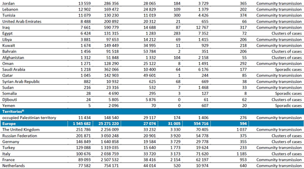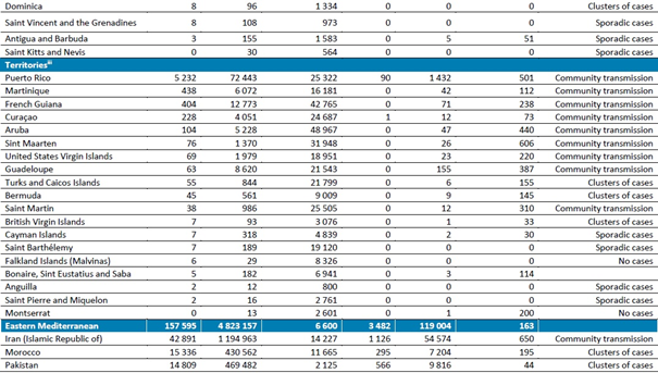 Doğu Akdeniz Bölgesi, bir önceki haftaya göre sırasıyla %9 ve %10'luk bir azalmayı yansıtan 157.000'den fazla yeni vaka ve 3400'den fazla yeni ölüm bildirmiştir. Bölgede vakalar ve ölümler üst üste beşinci haftada da azalmıştır. En yüksek yeni vaka sayıları İran İslam Cumhuriyeti (42.891 yeni vaka, 1 milyonda 511 yeni vaka), Fas (15.336 yeni vaka, 1 milyonda 415 yeni vaka) ve Pakistan'dan (14 809 yeni vaka, 1 milyonda 67 yeni vaka) bildirilmiştir. Bu üç ülke, önceki iki hafta içindeki en yüksek yeni vaka sayısını oluşturmuştur. En yüksek sayıda yeni ölüm İran İslam Cumhuriyeti (1126 yeni ölüm; 1 milyonda 13 yeni ölüm), Pakistan (566 yeni ölüm; 1 milyonda 3 yeni ölüm) ve Tunus'tan (300 yeni ölüm; 1 milyonda 25 yeni ölüm) bildirilmiştir.