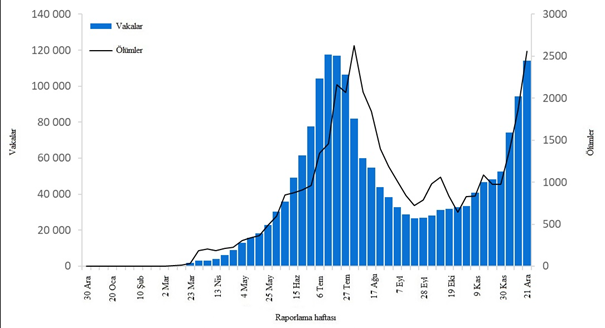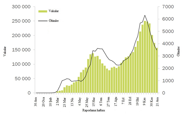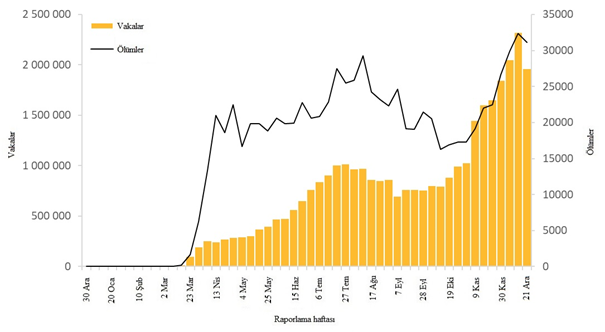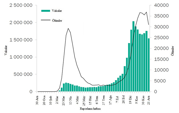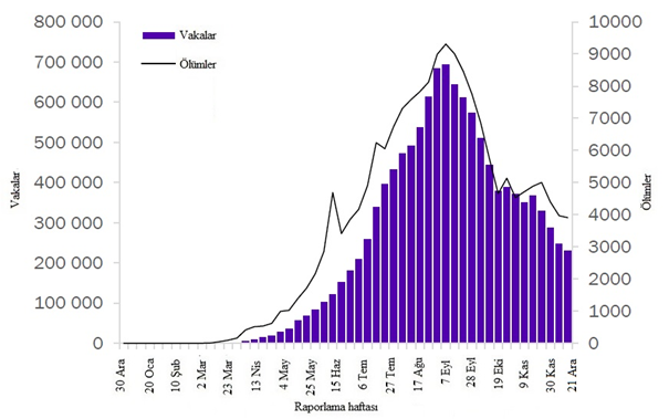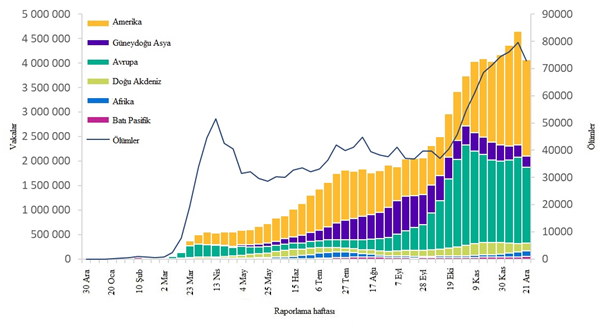 Geçen hafta küresel olarak 4 milyondan fazla yeni vaka bildirilmiştir. Bir önceki haftaya göre %12'lik bir düşüş olmasına rağmen, bu ve verilerdeki diğer kısa vadeli eğimler, yıl sonundaki tatil sezonu boyunca dikkatle yorumlanmalıdır. Çünkü rakamlar sunum, test ve raporlama gecikmelerinden etkilenebilir. Yeni ölümlerin sayısı %8 azalarak 72.730 olmuştur (Şekil 1, Tablo 1). Amerika Bölgesi, küresel olarak tüm yeni vakaların %48'ini ve tüm yeni ölümlerin %42'sini oluşturmaktadır. Yeni vaka ve ölümlerin sırasıyla %37 ve %42 olduğu Avrupa Bölgesi'nde oranlar yüksek seyrederken, her ikisi de bir önceki haftaya göre azalmıştır. Güneydoğu Asya ve Doğu Akdeniz bölgelerinde yeni vaka ve ölümler azalmıştır. Afrika Bölgesinde hem yeni vakalar hem de ölümler diğer bölgelere göre düşük kalırken, yeni vakalarda %20, yeni ölümlerde %37 artış olmuştur. Batı Pasifik Bölgesi'nde yeni vakalar %13, yeni ölümler %4 artmıştır.