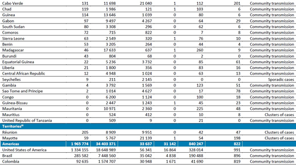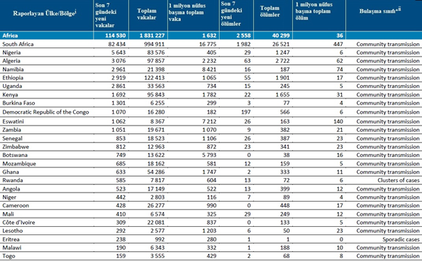 Geçen hafta, Afrika Bölgesinde bir önceki haftaya göre %20 artışla 114.000'den fazla yeni vaka ve bir önceki haftaya göre %37 artışla 2500'ün üzerinde ölüm bildirilmiştir. Güney Afrika, bölgedeki yeni haftalık vakalardaki en büyük oranı (%72) oluşturmaya devam etmektedir. Geçen hafta, en yüksek sayıda yeni vaka Güney Afrika (82.434 yeni vaka; 1 milyon nüfus başına 1390 yeni vaka), Nijerya (5643 yeni vaka; 1 milyonda 27 yeni vaka), Cezayir (3076 yeni vaka, 1 milyonda 70 yeni vaka) ve Namibya'dan (2961 yeni vaka, 1 milyonda 1165 yeni vaka) bildirilmiştir. En yüksek sayıda yeni ölüm ise Güney Afrika (1982 yeni ölüm; 1 milyonda 33 yeni ölüm), Demokratik Kongo Cumhuriyeti (197 yeni ölüm; 1 milyonda 2 yeni ölüm) ve Cezayir'den (63 yeni ölüm; 1 milyonda 1 yeni ölüm) bildirilmiştir.