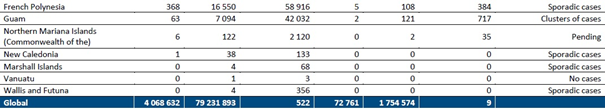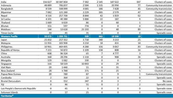 Batı Pasifik Bölgesi'nde, yeni vakalar (%13) ve ölümler (%4) artmaya devam etmiştir; bu son sekiz haftada görülen bir eğilimdir. Bölge 53.000'den fazla yeni vaka ve yaklaşık 700 yeni ölüm bildirmiştir. En yüksek yeni vakalar Japonya (21.432 yeni vaka; 1 milyonda 169 yeni vaka), Malezya (11.931 yeni vaka; 1 milyonda 369 yeni vaka) ve Filipinler'de (10.961 yeni vaka; 1 milyonda 100 yeni vaka) bildirilmiştir. Bu hafta en çok yeni ölüm bildiren ülkeler Japonya (340 yeni ölüm; 1 milyonda 3 yeni ölüm), Filipinler (156 yeni ölüm; 1 milyonda 1 yeni ölüm) ve Kore Cumhuriyeti (134 yeni ölüm; 1 milyonda 3 yeni ölüm) olmuştur.