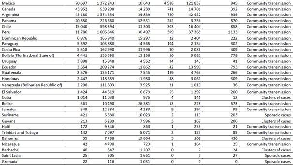 Geçen hafta, en fazla vaka bildiren beş ülke Amerika Birleşik Devletleri (1,3 milyondan fazla vaka ile önceki haftaya göre %19 azalma), Brezilya (285.000'den fazla vaka, %12 azalma), Büyük Britanya ve Kuzey İrlanda Birleşik Krallığı (251.000'den fazla vaka, %45 artış), Rusya Federasyonu (201.000'den fazla vaka, %3 artış) ve Hindistan (156.000'den fazla vaka, %10'luk bir azalma) olmuştur.