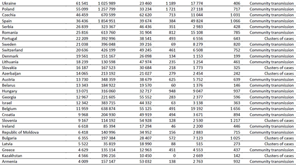 Avrupa Bölgesi'ndeki yeni vaka sayısı, geçen hafta 1,5 milyonun üzerinde rapor edilmesiyle yüksek olmaya devam etmektedir. Bununla birlikte, geçen hafta yeni vaka sayısı düşerek %12 azalırken, ölümler %15 azalarak 31.000 olmuştur. Gözlemlenen azalmalara rağmen, Avrupa Bölgesi küresel olarak ikinci en yüksek yeni vaka ve ölüm sayılarını (sırasıyla %37 ve %42) oluşturmaya devam etmektedir. Geçen hafta, en çok yeni vaka bildiren ülkeler Büyük Britanya ve Kuzey İrlanda Birleşik Krallığı (251.786 yeni vaka, 1 milyonda 3709 yeni vaka), Rusya Federasyonu (201.871 yeni vaka; 1 milyon nüfus başına 1383 yeni vaka) ve Almanya (146.849 yeni vaka; 1 milyonda 1753 yeni vaka) olmuştur. En yüksek ölüm sayısı aynı ülkelerden, yani Rusya Federasyonu (3920 yeni ölüm; 1 milyonda 27 yeni ölüm), Almanya (3729 yeni ölüm; 1 milyonda 45 yeni ölüm) ve Birleşik Krallık'tan (3330 yeni ölüm; 1 milyonda 49 yeni ölüm) bildirilmiştir.