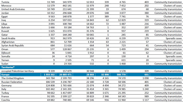 Avrupa Bölgesi, bir önceki haftaya göre sırasıyla %3 düşüş ve %2 artışla 1,5 milyonun üzerinde yeni vaka ve 3200 yeni ölümle çok sayıda vaka bildirmeye devam etmektedir. Son iki haftadır haftalık yeni vakalar azalmıştır. Bölge, tüm bölgeler arasında küresel yeni ölümlerin en yüksek oranını (%43) bildirmiştir. Geçen hafta, en çok yeni vaka bildiren ülkeler Büyük Britanya ve Kuzey İrlanda Birleşik Krallığı (343.784 yeni vaka, 1 milyonda 5064 yeni vaka), Rusya Federasyonu (186.539 yeni vaka; 1 milyonda 1278 yeni vaka) ve Almanya (124.808 yeni vaka; 1 milyonda 1490 yeni vaka) olmuştur. En yüksek ölüm sayısı Almanya (4494 yeni ölüm; 1 milyonda 54 yeni ölüm), Birleşik Krallık (4165 yeni ölüm; 1 milyonda 61 yeni ölüm) ve Rusya Federasyonu'ndan (3728 yeni ölüm; 1 milyonda 26 yeni ölüm) bildirilmiştir.