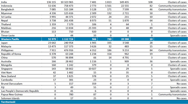 Geçen hafta, Batı Pasifik Bölgesi'nde bildirilen yeni vaka sayısında (53.000'in biraz altında) çok az değişiklik olurken, yeni ölümler bir önceki haftaya göre %10 artmıştır (700'ün üzerinde). Geçtiğimiz hafta yeni vakalardaki düzlük, dört haftalık artan eğilimlerin ardından gelmektedir. Bu hafta en fazla yeni vaka bildiren üç ülke Japonya (23.642 yeni vaka; 1 milyonda 187 yeni vaka), Malezya (13.473 yeni vaka; 1 milyonda 416 yeni vaka) ve Filipinler (7911 yeni vaka; 1 milyonda 72 yeni vaka) olmuştur. Bu hafta en fazla yeni ölüm bildiren üç ülke Japonya (335 yeni ölüm; 1 milyonda 3 yeni ölüm), Filipinler (186 yeni ölüm; 1 milyonda 2 yeni ölüm) ve Güney Kore (154 yeni ölüm; 1 milyonda 3 yeni ölüm) olmuştur.