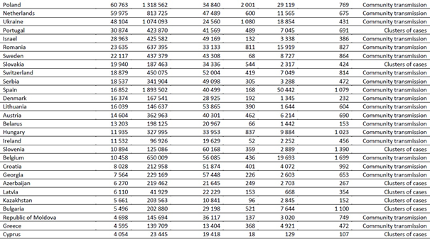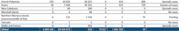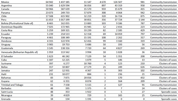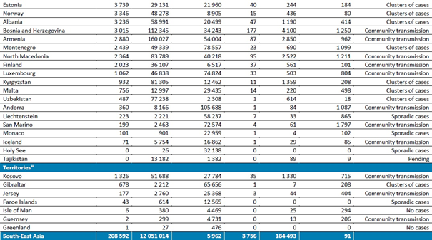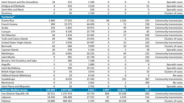Geçen hafta en fazla vaka bildiren beş ülke, Amerika Birleşik Devletleri (1.325.424 vakayla küresel vakaların üçte birinden biraz azı ve geçen haftaya göre değişmemiştir), Büyük Britanya ve Kuzey İrlanda Birleşik Krallığı (343.784 vaka, geçen haftaki hızlı artışı %36 artışla sürdürmektedir), Brezilya (252.018 vaka, %11 düşüş), Rusya Federasyonu (186.539 vaka, %7 azalma) ve Hindistan (136.115 vaka, %13 azalma) olmuştur.