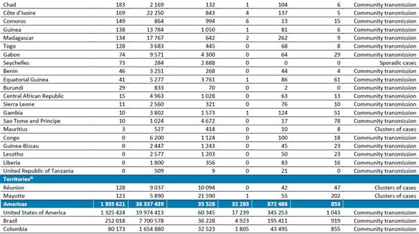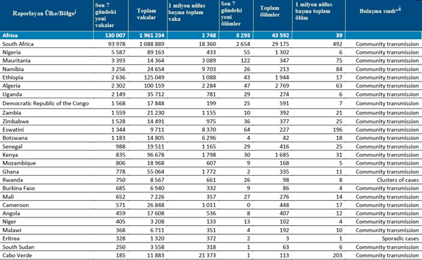 Geçen hafta, Afrika Bölgesinde bir önceki haftaya göre %13 artışla 130.000'den fazla yeni vaka ve bir önceki haftaya göre %4 artışla 3000'den fazla ölüm bildirilmiştir. Geçen hafta, Güney Afrika (93.978 yeni vaka; 1 milyon nüfus başına 1585 yeni vaka), Nijerya (5587 yeni vaka; 1 milyonda 27 yeni vaka), Moritanya (3393 yeni vaka, 1 milyonda 730 yeni vaka) ve Namibya (3256 yeni vaka, 1 milyonda 1281 yeni vaka) en yüksek yeni vaka sayısını bildirmiştir. En yüksek yeni ölüm sayısı Güney Afrika (2654 yeni ölüm; 1 milyonda 45 yeni ölüm), Moritanya (122 yeni ölüm; 1 milyonda 26 yeni ölüm) ve Eswatini Krallığı'ndan (64 yeni ölüm; 1 milyonda 55 yeni ölüm) bildirilmiştir.