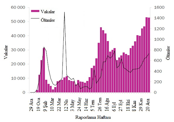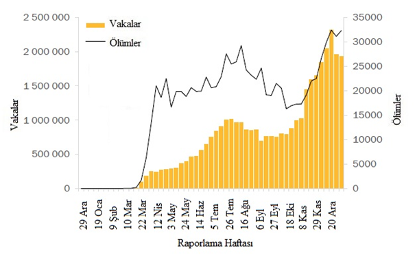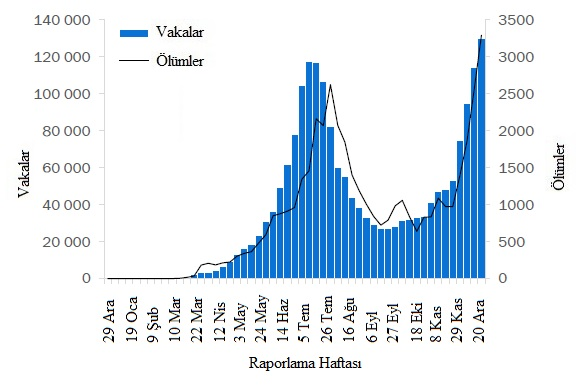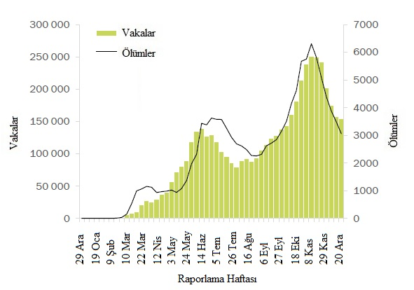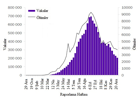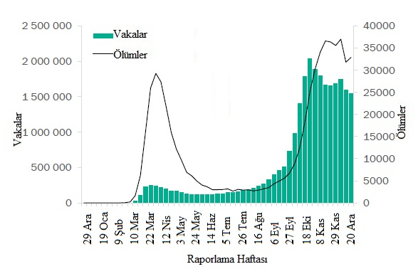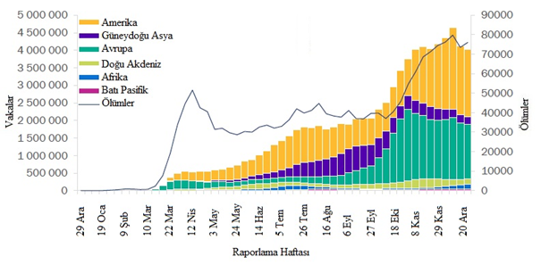Arka arkaya üçüncü haftada da küresel olarak 4 milyondan fazla yeni vaka rapor edilmiştir, ancak bu hafta önceki haftaya göre hafif bir düşüş görülmüştür. Bununla birlikte, verilerdeki bu ve diğer kısa vadeli eğilimler, yılsonundaki tatil sezonu nedeniyle dikkatle yorumlanmalıdır çünkü rakamlar sunum, test ve raporlama gecikmelerinden etkilenebilmektedir. Yeni ölümlerde geçen hafta görülen düşüş, ölümlerin %3 artarak 76.000'e çıkmasıyla tersine dönmüştür (Şekil 1, Tablo 1). Amerika Bölgesi, geçen hafta küresel olarak tüm yeni vakaların %47'sini ve tüm yeni ölümlerin %42'sini oluşturmuştur. Avrupa Bölgesinde sırasıyla %38 ve %43 olan yeni vakalar ve ölümler yüksek kalmış, yeni vakalarda hafif bir düşüş ve yeni ölümler de hafif bir artış göstermiştir. Güneydoğu Asya ve Doğu Akdeniz bölgelerinde yeni vaka ve ölümler azalmaya devam etmektedir. Afrika Bölgesinde hem yeni vakalar hem de ölümlerdaki mutlak sayılar düşük kalırken, üst üste dördüncü haftada, bölge haftalık olarak bildirilen vaka sayılarında küresel olarak en büyük artış yüzdesini bildirmiştir ve bu hafta yeni vakalarda %13 ve yeni ölümlerde %28 artış daha olmuştur. Batı Pasifik Bölgesi'nde, yeni vakalar önceki haftaya benzer kalmış, ancak yeni ölümler %10 artmıştır. Yeni Yılı karşılarken ve dünya çapında COVID-19 aşılama kampanyalarına hevesle bakarken, rekor sayıdaki yeni vaka ve ölümle birlikte mevcut epidemiyolojik durum, daha fazla bulaş ve can kaybını önlemek için güvenlik önlemlerine bağlı kalmayı zorunlu kılmaktadır.