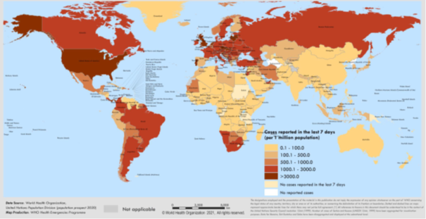 Şekil 2. Ülkelere ve bölgelere göre, son yedi günde 1 milyon nüfus başına bildirilen COVID-19 vakası, 28 Aralık 2020 – 3 Ocak 2021 **