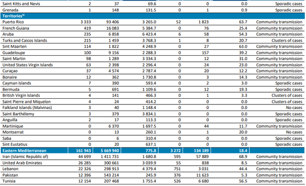 Doğu Akdeniz Bölgesi, geçen haftaya göre % 5'lik bir düşüşle 161.000'den fazla yeni vaka bildirmiştir. Bölge % 9'luk bir artışla 3200 yeni ölüm vakası bildirmiştir. En çok yeni vaka bildiren üç ülke; İran (44699 yeni vaka, 100.000 kişi başına 53,2 yeni vaka,% 5 artış), Lübnan (22326 yeni vaka, 100 başına 327,1 yeni vaka) ve Birleşik Arap Emirlikleri (26 285 yeni vaka, 100.000 başına 265,8 yeni vaka,% 7 artış) olmuştur.