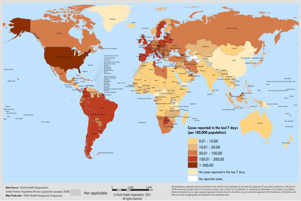Küresel olarak, geçen hafta 3,7 milyon yeni vaka bildirilmiş olup bir önceki haftaya göre % 13'lük bir düşüşle art arda üçüncü haftada da vaka sayılarındaki azalma devam edilmiştir. 96.000 yeni ölüm vakası görülmüş olup önceki haftaya göre % 'lik bir düşüş gerçekleşmiştir. Böylece 222 ülke ve bölgeden bildirilen toplam vaka sayısı 102 milyonun üzerine çıkmış ve toplam ölüm sayısı ise 2,2 milyonu geçmiştir