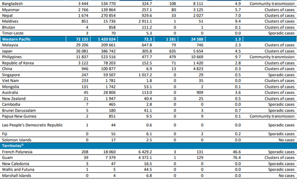 Bu hafta en fazla yeni ölüm vakası rapor eden üç ülke; Japonya (635 yeni ölüm; 100.000'de 0,5 yeni ölüm,% 8 artış), Filipinler (479 yeni ölüm; 100.000'de 0,4 yeni ölüm,% 11 artış) oldu ve Malezya (79 yeni ölüm; 100.000'de 0,2 yeni ölüm,% 56 artış) olmuştur.