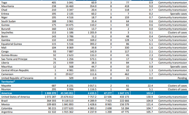 Geçen hafta, Afrika Bölgesi bir önceki haftaya göre 108.000'den fazla vaka ve 4600'den fazla ölüm, vakalarda ise % 27'lik ve ölümlerde ise % 8'lik bir düşüş bildirmiştir. Vakalarda müteakip iki hafta boyunca bir azalma olmuştur. En yüksek sayıda yeni vaka bildiren ülkeler; Güney Afrika (44397 yeni vaka; 100.000 nüfus başına 74,9 yeni vaka;% 44 azalma), Nijerya (9955 yeni vaka; 100.000 başına 4.8 yeni vaka;% 15 azalma) ve Zambiya (8760 yeni vaka; 100.000'de 47,7 yeni vaka;% 3 artış) olmuştur.