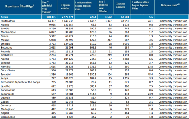 Geçen hafta en çok yeni ölüm vakası bildiren ülkeler; Güney Afrika (3377 yeni ölüm; 100.000'de 5,7 yeni ölüm;% 9 azalma), Zimbabwe (219 yeni ölüm; 100.000'de 1,5 yeni ölüm;% 25) azalma) ve Malavi (217 yeni ölüm; 100.000 başına 1.1 yeni ölüm;% 28 artış) olmuştur.