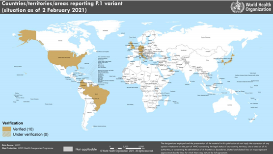 Şekil 7. 2 Şubat 2021 itibarıyla SARS-CoV-2 P.1 varyantını bildiren ülkeler, yönetim bölgeleri ve bölgeler