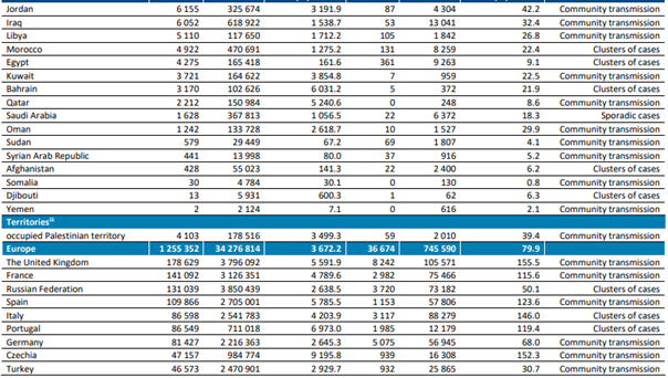 En çok yeni ölüm vakası bildiren ülkeler; Lübnan (751 yeni ölüm, 100.000'de 11.0 yeni ölüm,% 81 artış), İran (595 yeni ölüm, 100.000 kişi başına 0.7 yeni ölüm,% 3 artış) ve Tunus (526 yeni ölüm, 100.000'de 4,5 yeni ölüm,% 2 azalma) olmuştur.