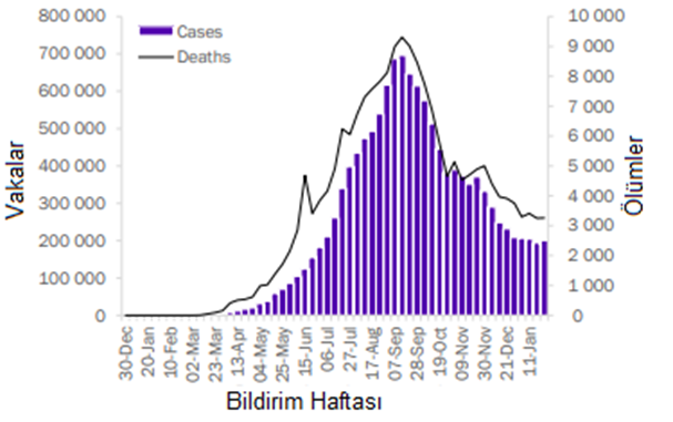 Küresel olarak, geçen hafta 3,7 milyon yeni vaka bildirilmiş olup bir önceki haftaya göre % 13'lük bir düşüşle art arda üçüncü haftada da vaka sayılarındaki azalma devam edilmiştir. 96.000 yeni ölüm vakası görülmüş olup önceki haftaya göre % 'lik bir düşüş gerçekleşmiştir (Şekil 1). Böylece 222 ülke ve bölgeden bildirilen toplam vaka sayısı 102 milyonun üzerine çıkmış ve toplam ölüm sayısı ise 2,2 milyonu geçmiştir. Geçen hafta, Güneydoğu Asya dışındaki tüm DSÖ bölgeleri yeni vakalarda düşüş bildirmiştir (Tablo 1). Yeni ölüm vakası sayıları küresel olarak % 1 oranında azalmasına rağmen Batı Pasifik (% 21), Doğu Akdeniz (% 9) ve Amerika bölgelerinde (% 4) artmıştır.