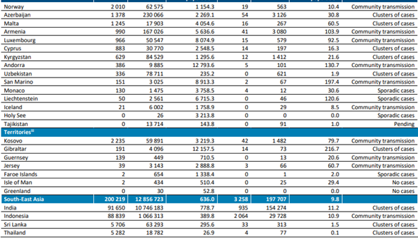 Bu hafta en çok yeni ölüm vakası bildiren üç ülke; Endonezya (2064 yeni ölüm; 100.000'de 0,8 yeni ölüm,% 9 artış), Hindistan (935 yeni ölüm; 100.000'de <0,1 yeni ölüm,% 12 azalma) oldu ) ve Bangladeş (108 yeni ölüm; 100.000'de <0.1 yeni ölüm;% 10 azalma) olmuştur.