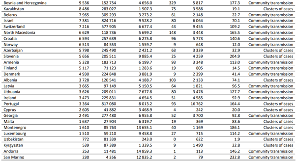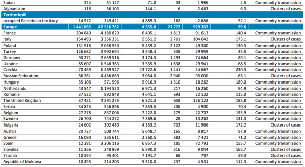 En çok ölüm vakası bildiren ülkeler; Rusya Federasyonu (2940 yeni ölüm; 100.000 kişi başına 2,0 yeni ölüm, % 2 azalma), İtalya (2761 yeni ölüm; 100.000'de 4,6 yeni ölüm; %20 artış) ve Polonya (2122 yeni ölüm; 100.000 kişi başına 5,6 yeni ölüm,% 12 artış) olmuştur.