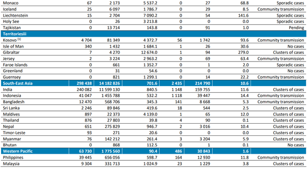 Güneydoğu Asya bölgesi, bir önceki haftaya göre % 49’luk artışla 298.000 yeni vaka, ölüm oranlarında ise % 14'lük bir artışla 2400’den fazla yeni ölüm vakası bildirmiştir. Yeni vakaların %80’i Hindistan'dan bildirilmiştir. En çok yeni vaka bildiren üç ülke; Hindistan (240.082 yeni vaka; 100.000'de 17,4 yeni vaka,% 62 artış), Endonezya (41.047 yeni vaka; 100.000'de 15,0 yeni vaka; yeni vaka yüzde oranı bir önceki haftaya benzer) ve Bangladeş (12.470 yeni vaka; 100.000 başına 7,6 yeni vaka;% 91 artış) olmuştur.