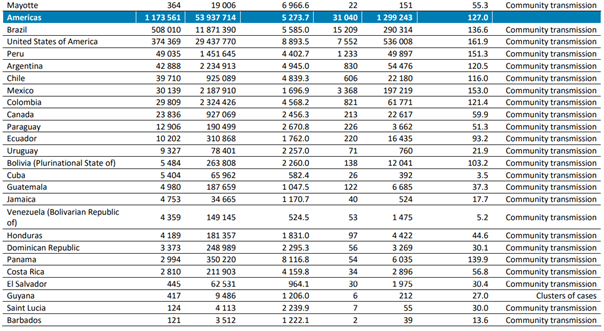 Amerika Bölgesinde bu hafta 1.2 milyondan fazla yeni vaka ve 31.000'in biraz üstünde yeni ölüm bildirilmiş olup bir önceki haftaya göre vaka sayılarında % 5'lik bir düşüş ölüm oranında ise % 2'lik bir artış olmuştur. Ölüm vakalarındaki altı haftalık düşüşün ardından, bu hafta hafif bir artış bildirilmiştir. En çok yeni vaka bildiren ülkeler; Brezilya (508.010 yeni vaka; 100.000 nüfus başına 239 yeni vaka;% 3 artış), Amerika Birleşik Devletleri (374.369 yeni vaka; 100.000 başına 113,1 yeni vaka; % 19 azalma) ve Peru (49.035 yeni vaka; 100.000 başına 148,7 yeni vaka;% 11 artış) olmuştur.