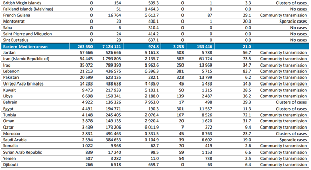 Doğu Akdeniz Bölgesinde, bir önceki haftaya göre % 8'lik bir artışla 264.000 yeni vaka % 12'lik bir artışla 3200’ün biraz üzerinde yeni ölüm vakası bildirilmiştir. Son altı haftada yeni haftalık vakalar artış gösterirken son dört haftadır ölüm vakaları da artış göstermektedir.