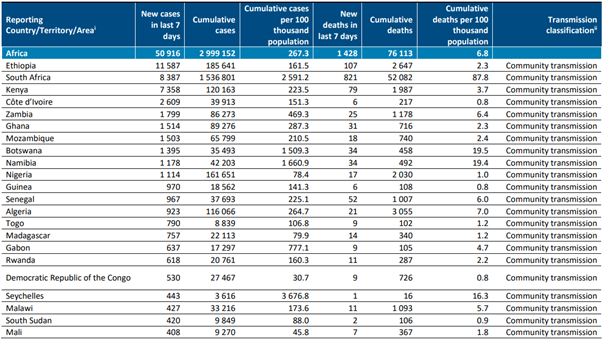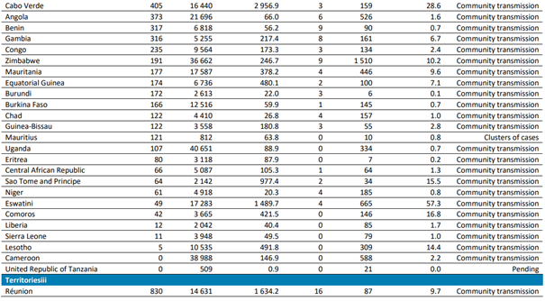 Afrika Bölgesi bir önceki haftaya göre 51.000 yeni vaka ve 1400’den fazla ölüm, vakalarda % 3'lük düşüş, ölümlerde ise % 10'luk bir artış olduğunu bildirmiştir. Geçen sekiz hafta içinde ilk kez, yeni ölümlerde bir artış bildirilmiştir.