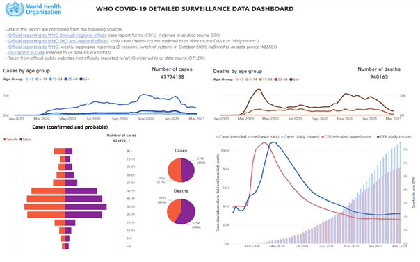 14 Mart 2021 itibariyle, toplam 186 ülke, yönetim bölgesi ve bölge, vaka raporu formları veya DSÖ ile haftalık toplu sürveyans yoluyla ayrıntılı verileri paylaşmıştır. Şu anda dünya çapında bildirilen 119 milyon vakayla ilgili olarak, 86.4 milyon vaka (% 73) hakkında DSÖ'ye bilgi ulaşmıştır. 59 milyondan fazla vakanın (% 50) cinsiyet , 45 milyon vakanın (% 38) yaşı ve 42 milyon vakanın (% 36) ise yaş ve cinsiyet bilgileri birlikte rapor edilmiştir. Ayrıca, sistemde kaydedilen 1,6 milyondan biraz fazla vaka ve 25.000 ölüm ile sağlık çalışanları arasında COVID-19 vakalarına ilişkin veriler de bulunmaktadır.