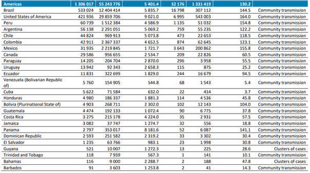 Amerika Bölgesinde bu hafta 1.3 milyondan fazla yeni vaka ve 32.000'den fazla yeni ölüm bildirilmiş olup bir önceki haftaya göre vaka sayılarında % 11'lik bir artış ölüm oranında ise % 4'lük bir artış olmuştur. Genel olarak, son beş haftada haftalık olarak bildirilen yeni vakalarda artış eğilimi olmuştur. Önceki altı haftadaki ölüm oranlarındaki düşüşün ardından son iki hafta içinde yeni ölümlerde hafif bir artış bildirilmiştir. En çok yeni vaka bildiren ülkeler; Brezilya (533.024 yeni vaka; 100.000 nüfus başına 250,8 yeni vaka;% 5 artış), Amerika Birleşik Devletleri (421.936 yeni vaka; 100.000 başına 127,5 yeni vaka; % 13 artış) ve Peru (60.739 yeni vaka; 100.000 başına 184,2 yeni vaka;% 24 artış) olmuştur.