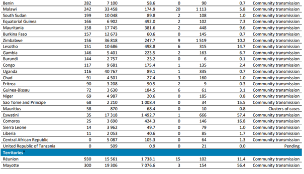 En yüksek sayıda yeni vaka bildiren ülkeler sırasıyla; Etiyopya (13.153 yeni vaka; 100.000 kişi başına 11,4 yeni vaka;% 14 artış) ve Kenya (9167 yeni vaka; 100.000 kişi başına 17 yeni vaka;% 25 artış) olmuştur.