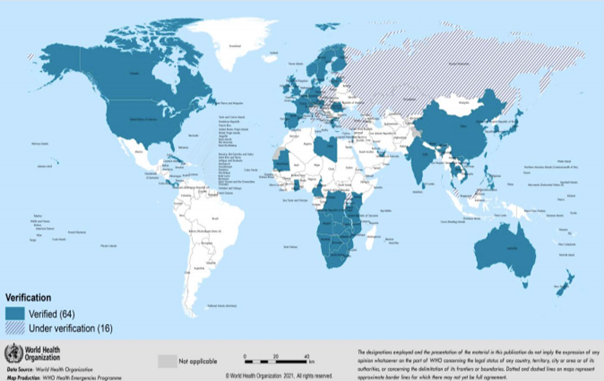 SARS-CoV 2 varyant vakalarını tespit etmeye yönelik sürveyans faaliyetleri, sistematik genomik sekanslama dahil olmak üzere yerel ve ulusal düzeylerde güçlendirildikçe, VOC bildiren ülkelerin sayısı artmaya devam etmiştir (Tablo 3, Şekil 4-6, Ek 2). Bu bilgiler, sekanslama kapasitesi ve sıralama için numunelerin önceliklendirilmesinde ülkeler arasındaki farklılıklar dahil ancak bunlarla sınırlı olmamak üzere, sürveyans sınırlamaları dikkate alınarak yorumlanmalıdır. DSÖ, sürveyans ve sekanslama kapasitesinin güçlendirilmesi ve yerel epidemiyolojik durum ve kapasiteye ve olağandışı olayların tespitine dayalı olarak SARS-CoV-2 varyantlarının bulaşma kapsamının temsili bir göstergesini sağlamak için sistematik bir yaklaşımı savunmaya devam etmektedir.
