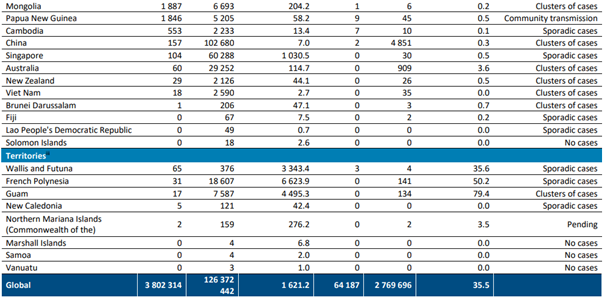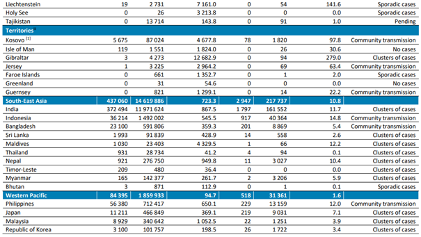 Bu hafta en çok yeni ölüm vakası bildiren üç ülke; Hindistan (1797 yeni ölüm; 100.000'de <0,1 yeni ölüm, %57 artış), Endonezya (917 yeni ölüm; 100.000'de 0,3 yeni ölüm,% 18 azalma) ve Bangladeş (201 yeni ölüm; 100.000'de <0,1 yeni ölüm; %43 artış) olmuştur.