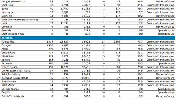 En çok ölüm vakalarının bildirildiği ülkeler yine; Brezilya (16.798 yeni ölüm; 100.000'de 7,9 yeni ölüm;% 10 artış), Amerika Birleşik Devletleri (6995 yeni ölüm; 100.000'de 2,1 yeni ölüm; % 7 azalma) ve Meksika (3643 yeni ölüm; 100.000'de 2,8 yeni ölüm;% 8 artış) olmuştur.