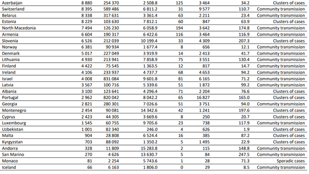 En çok ölüm vakası bildiren ülkeler; İtalya (2994 yeni ölüm; 100.000 kişi başına 5,0 yeni ölüm, % 8 artış), Rusya (2710 yeni ölüm; 100.000'de 1,9 yeni ölüm; %8 azalma) ve Polonya (2584 yeni ölüm; 100.000 kişi başına 6,8 yeni ölüm,% 22 artış) olmuştur.